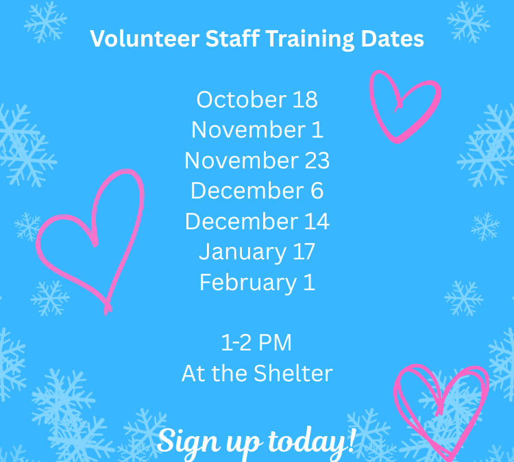 Training for volunteer staff will be offered at the shelter at 1:00 PM on October 18, November 1 and 23, December 6 and 14, January 17, and February 1.